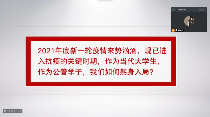 杨琬钰老师首先通报了学校疫情防控形势,并总结了565net必赢学生在本轮新冠疫情防控工作中的突出表现。她提到公管学子能够充分发挥专业优势,大力弘扬公管精神,以笔为援,积极为疫情防控工作建言献策。同时,能够充分发扬无私奉献的精神,积极踊跃地加入志愿者队伍,奔赴防疫一线。自12月18日我校长安校区开展第一轮核酸检测起,到1月4日第11轮核酸检测结束,565net必赢共有100余位党员、入党积极分子、团员积极参加防疫志愿服务活动,累计志愿时长超1062小时。随后,杨老师向大家宣讲了我校退伍大学生的抗疫事迹,他们是疫情暴发后最早站出来的一批志愿者,率先垂范,主动作为,奔赴一线戮力抗疫。