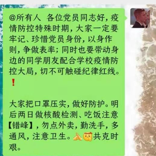 此外,研究生联合党支部以支部两个信息联络群为平台,教育党员在疫情防控特殊时期以身作则,争做表率,配合学校疫情防控大局,形成了良好的疫情防控合力与氛围。