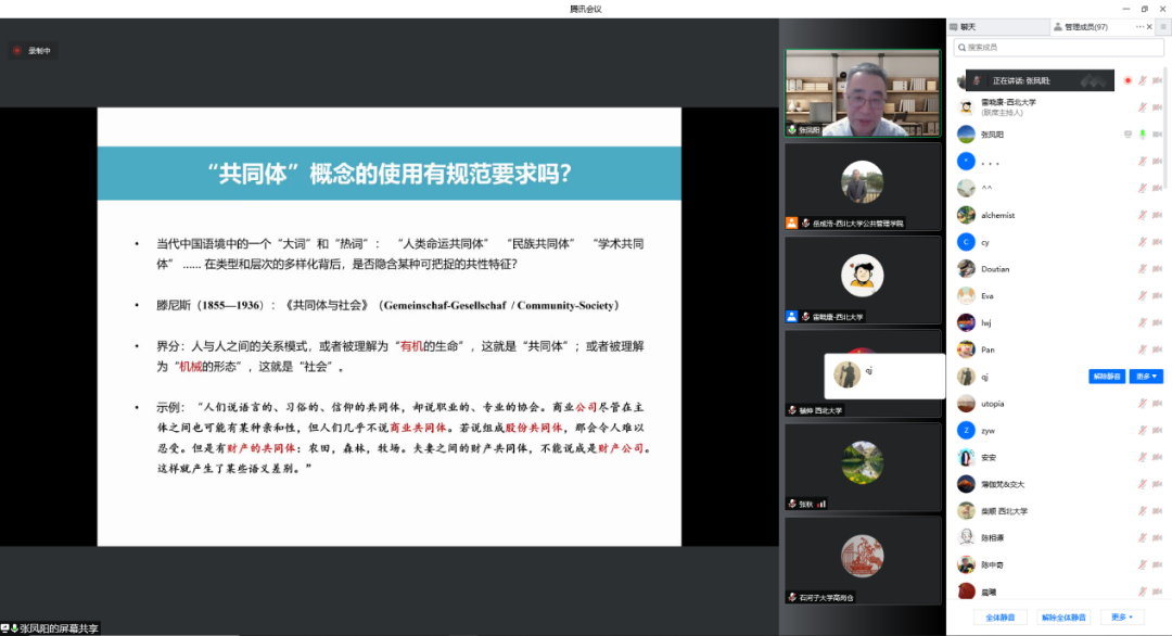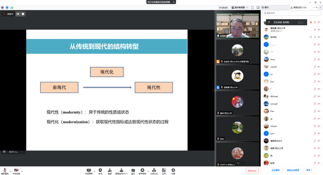 2022年5月20日晚,由西北大学社科处、565net必赢联合主办的名家讲坛在线成功举办。教育部特聘教授、南京大学政府管理学院张凤阳教授受邀作了题为“现代性视角下的共同体构建”的学术报告。565net必赢(应急管理学院)院长雷晓康教授主持讲座,来自北京大学、厦门大学、西安交通大学、吉林大学、西北大学等多所高校的160多名师生参与了此次讲座。