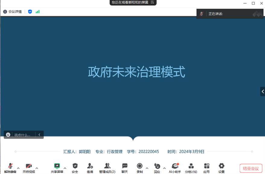 徐咪博士对其汇报内容进行了点评。她表示这本书是对我国数据要素市场建设相关内容的阶段性总结,也是对其相关概念较为系统、较为全面的阐释。另外,数据要素、数字经济等相关内容在近年来的讨论比较火热,也与近期两会中的“新质生产力”密切相关,对行政管理专业的相关研究具有十分重要的参考意义,最后,她建议同学们要善于将数据意识与自己的研究方向相结合。