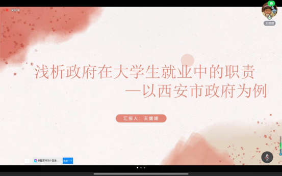 王媛媛同学汇报的题目是《浅析政府在大学生就业中的职责》。汇报重点以西安市政府为例阐述了政府在大学生就业中的职责,首先分析了西安市的就业环境、毕业生的专业属性和就业区域情况。其次介绍了西安市政府在大学生就业中履行的职责分类,如引导大学生实习就业,鼓励大学生自主创业,鼓励大学生服务基层和为大学生提供就业服务等。然后分析了政府在大学生就业中存在的不足,如政府未能充分执行其宏观调控的职责;政府在大学生就业服务中监督管理责任不到位;政府在大学生就业服务中保障措施不够完善。最后基于提出的问题,进一步分析了政府在大学生就业中充分发挥职责的优化建议。