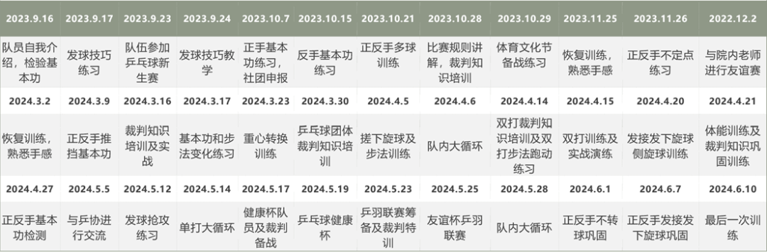 通过日常培训,队内共有20人次在乒乓球体育课或通识课期末考试中取得反手50+、正手40+(均为满分)的成绩;队内20余人熟练掌握裁判知识,近一年向各大比赛输送裁判共19人次。