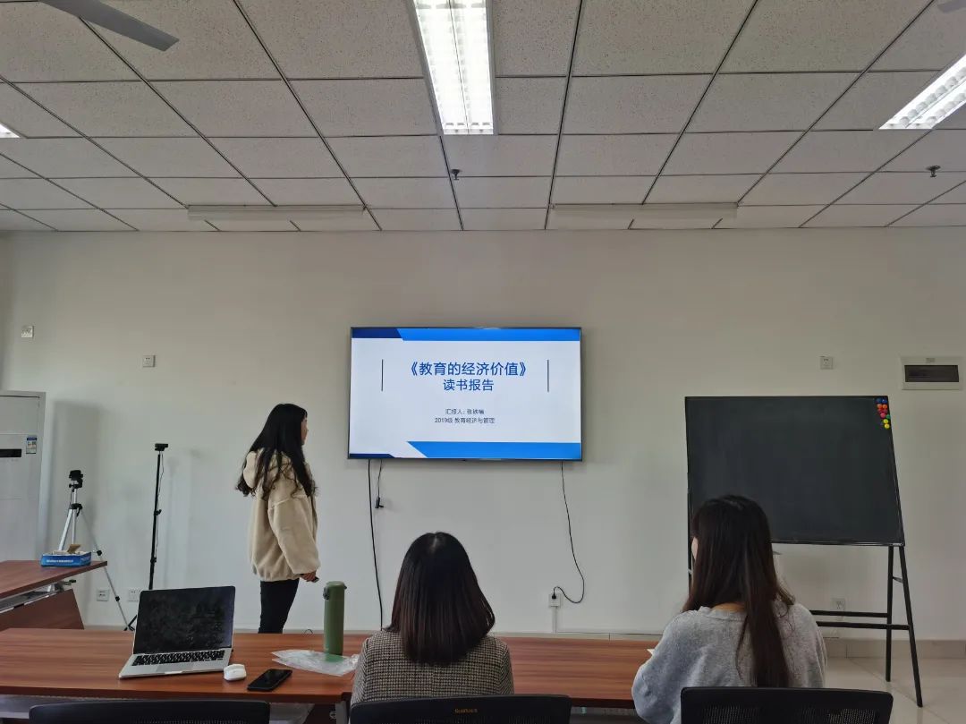 2019级教育经济与管理专业硕士研究生张铁楠同学分享的是西奥多·V·舒尔茨所著的《教育的经济价值》一书。她的汇报首先对本书作者进行了简要的介绍,讲解了本书的写作背景、写作逻辑和整体框架,进而总结了重要论点,学校教育是人力资本的最大投资。其次她介绍了本书的主要内容,讲述了教育费用中“放弃的收入”和教育收益率等以及学校教育对人的生产能力提高等教育的经济价值。最后她提出了对本书的批判性评价和对现实的启示,对教育市场化和我国教育发展都有借鉴意义。