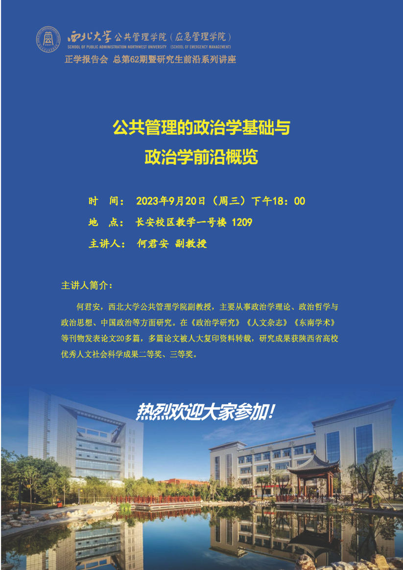 2023年9月20日晚,西北大学565net必赢何君安副教授在长安校区1209教室为我院2023级全体硕士研究生作了题为“公共管理的政治学基础与政治学前沿概览”的专题讲座。