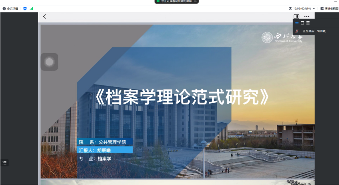 2021级档案学专业硕士研究生胡辰曦和我们分享了丁华东的《档案学理论范式研究》一书,她分别从作者简介、著作背景和主要观点三个方面展开汇报。她首先基于科学社会学、科学哲学视野,运用库恩的范式转化理论,探讨了档案学理论范式的构建及其影响因素,将当前档案学界的理论范式分为了传统、主流、前沿三大类进行介绍理清了档案学理论范式之间的关系。随后,她依据档案的史料属性、文件属性、信息资源属性、知识资源属性以及社会记忆属性,认为在档案学发展中存在着档案史料整理理论范型、档案文件管理理论范型、档案信息资源管理理论范型、档案知识资源管理理论范型与档案记忆理论范型。