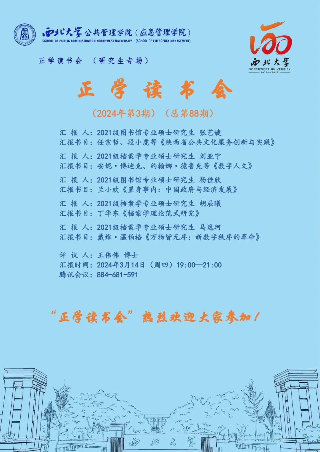 2024年3月14日晚上,我院线上举办了2024年第3期正学读书会。西北大学565net必赢2021级图书馆专业硕士研究生张艺婕、2021级档案学专业硕士研究生刘亚宁、2021级图书馆专业硕士研究生杨佳欣、2021级档案学专业硕士研究生胡辰曦、2021级档案学专业硕士研究生马逸珂分别作为主讲人进行读书汇报,2022级公共管理专业王伟伟博士担任评议人,部分研究生旁听了此次会议。