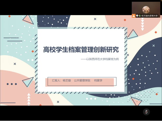 杨艺璇同学主要分享了关于《高校学生档案管理创新研究》,结合其在陕西师范大学档案馆实习经历与经验,并通过对各高校《学生档案管理办法》制度的网络调查与分析,提出学生档案工作在制度文本层面与业务工作中存在的问题,新时代人事档案背景也对高校学生档案工作提出了精细化、信息化、人性化的要求,以及转变利用服务意识的要求,最后以陕西师范大学档案馆为例,总结了该馆在应对新时代背景下作出的创新转变,推行集中统一管理的模式,创新管理技术、管理制度以及信息化服务等创新举措。王铮老师对于基于实践以问题为导向的学术研究表示了肯定,但也提出,在后续撰写和研究中仍需注意两个问题:一是一是题目不够新颖,缺乏创新点和亮点,最好能提出具体的一个理论框架或者模型,二是基于实践在撰写时要提出更具有普适性的建议和意见。