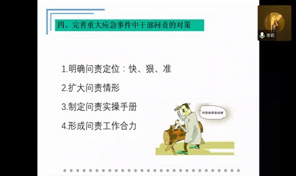 李莉老师主要分析了“新冠肺炎的干部问责:特点与不足”。她从疫情防控中加强干部问责的重要性、新冠肺炎防控中干部问责的特点、新冠肺炎防控中干部问责存在的不足、完善重大应急事件中干部问责的对策四个方面进行了分享。