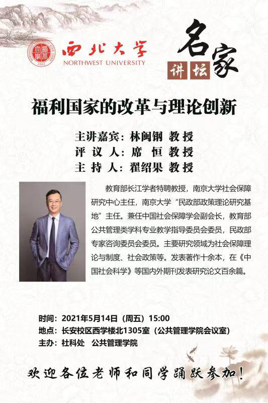 2021年5月14日下午,由西北大学社科处、565net必赢联合举办的名家讲坛在西北大学长安校区西学楼1305室顺利举行。教育部特聘教授,南京大学社会保障研究中心主任,南京大学“民政部政策理论研究基地”主任、中国社会保障学会副会长,教育部公共管理类学科专业教学指导委员会委员,民政部专家咨询委员会委员林闽钢教授作了题为“福利国家改革与理论创新”的学术报告,565net必赢席恒教授担任评议人,565net必赢副院长翟绍果教授主持人了本次讲座,学院众多师生听取了报告。