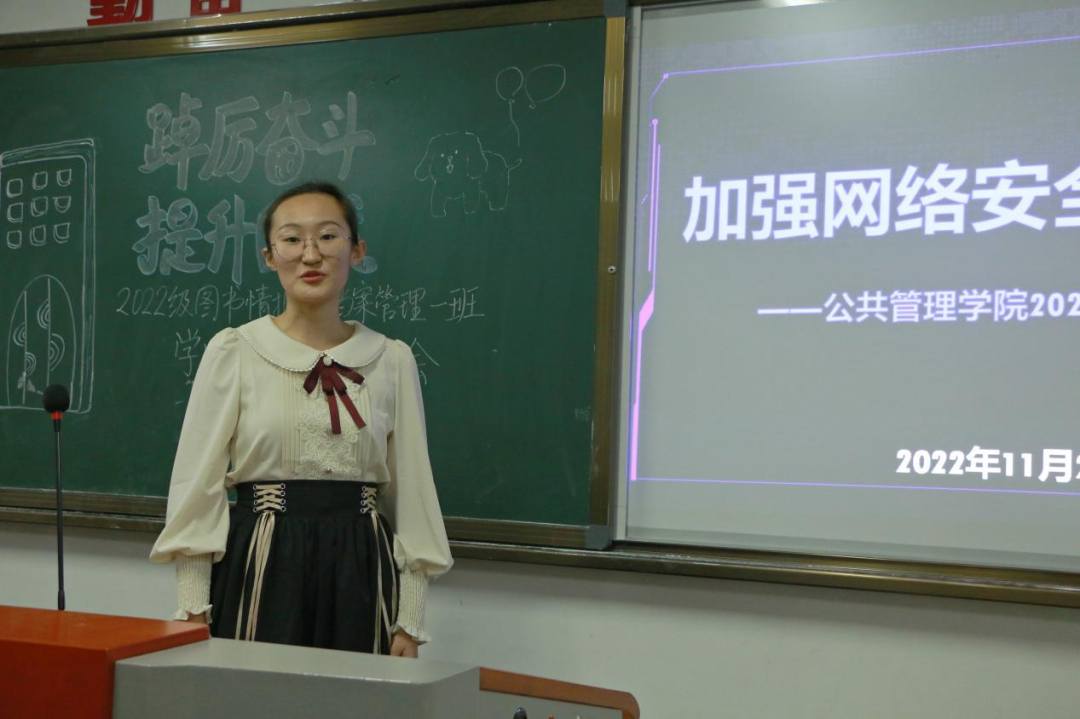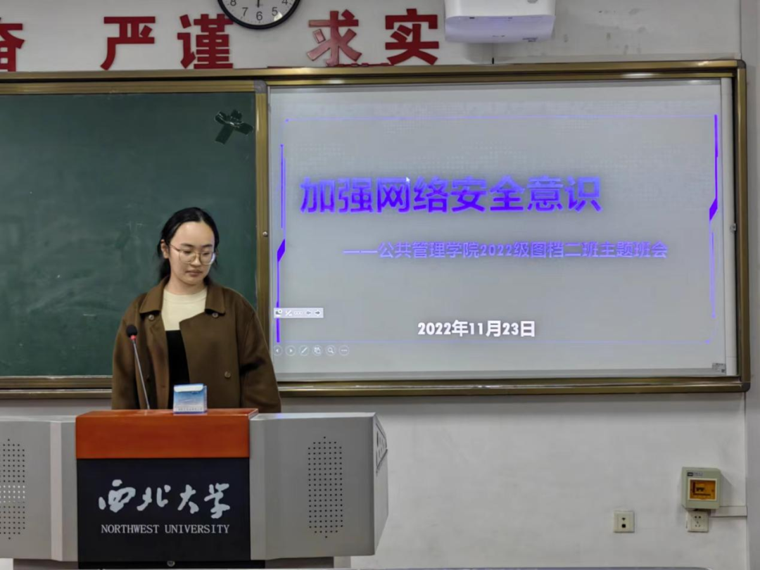 为提高同学们的网络安全意识,增强个人责任感,公管二班于11月23日下午在1104教室举办“网络安全教育”主题班会。宣传委员惠敏婕从网络行为及特点、具体案例以及网络行为准则三个方面为大家进行讲解。她提到“网络行为与我们的生活是息息相关的,互联网已被全面应用在大学生的学习、工作和生活之中,因此要格外重视网络的正向特点与负向特点。”同时,她介绍了网络对大学生的双面影响,提醒大家不要沉溺于虚拟的网络世界而逃避现实社会的责任与义务。随后,相关案例的讲解警示了大家要增强明辨是非的能力,提高警惕,树立正确的价值观,做有礼貌、有道德、有底线的新时代网民。最后,惠敏婕同学就遵守网络行为准则提出建议,希望大家不信谣、不传谣,警惕网络骗局与危害、自觉抵制腐朽文化、宣扬真善美、严格遵守法律法规。