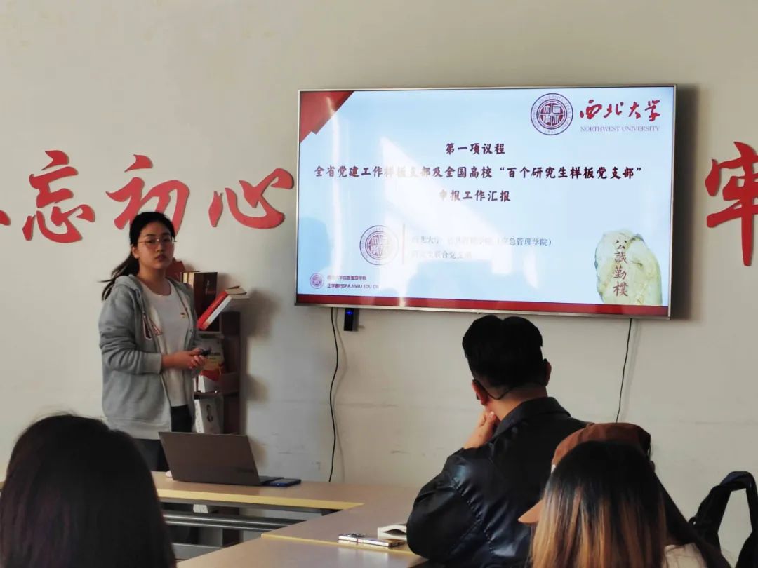 会议第一项议程为支部工作汇报。支部书记张珺敏同志就全国党建工作样板党支部及全国高校“百个研究生样板支部”申报工作为支部党员同志汇报最近的工作进展,让支部成员对党组织建设有了更深入了解,提升了支部同志的组织认同以及集体荣誉感。成员纷纷表示今后要更加努力,无论是在学业还是在科研活动中都要时刻谨记自身代表着研究生联合党支部,会继续不忘初心,牢记使命,做好个人生涯规划。