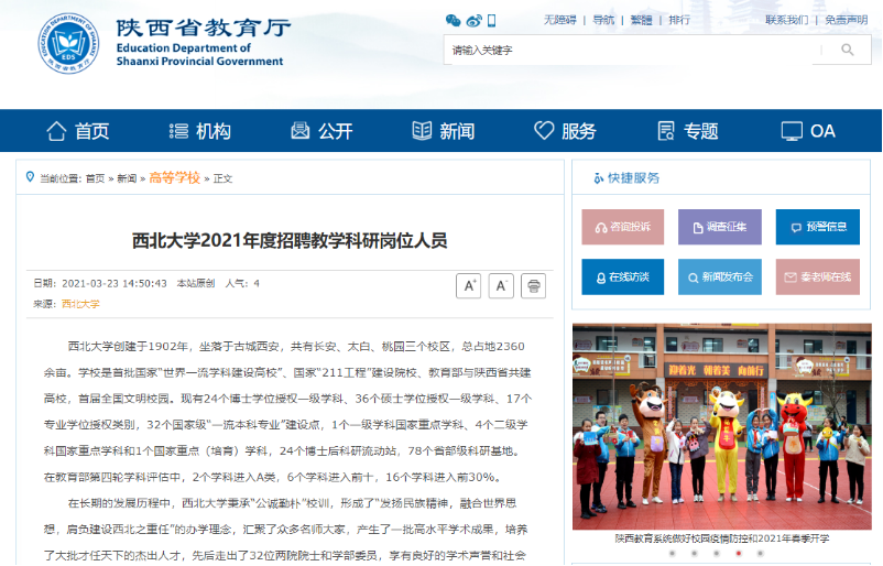 陕西省教育厅新闻链接:http://jyt.shaanxi.gov.cn/jynews/gdxx/202103/23/111677.html