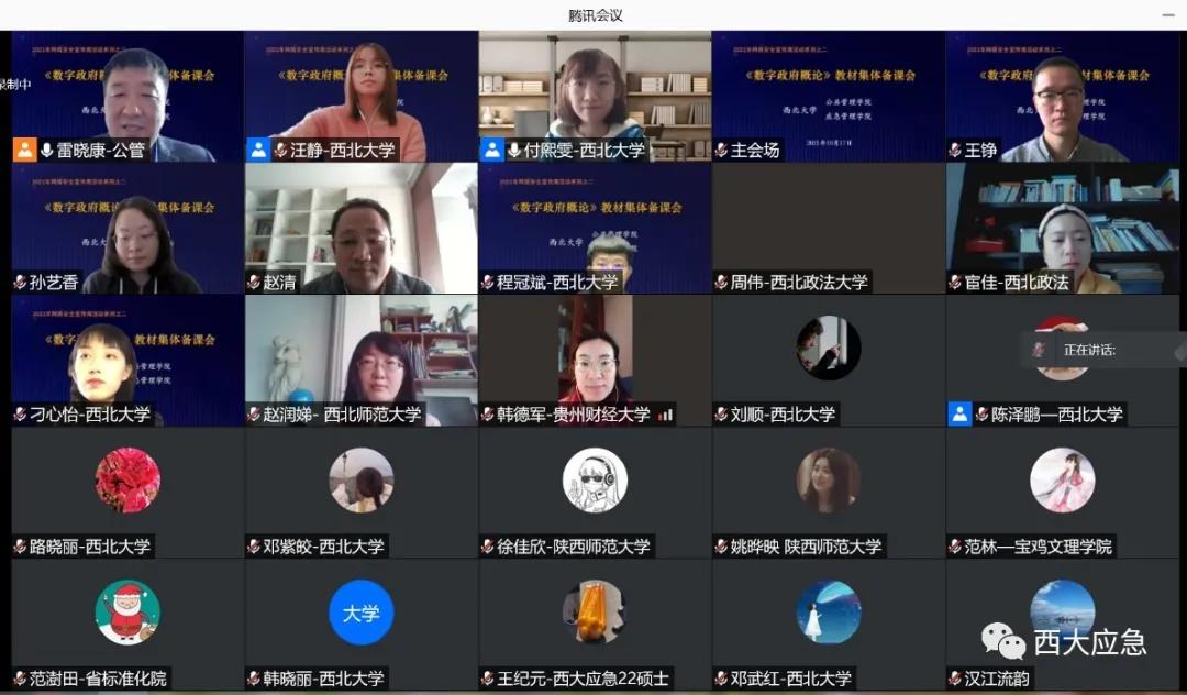 2021年10月17日上午,《数字政府概论》教材编写启动会在565net必赢客户端召开。会议由雷晓康院长、付熙雯教授共同主持,来自陕西省社会科学院经济所、西北大学、陕西师范大学、西北政法大学、西北师范大学、内蒙古大学、贵州财经大学等高校的多位专家学者参加了本次会议。