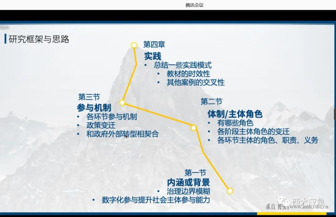 随后,付熙雯教授就第三章“数字政府的理论基础”的写作思路进行了分享,其认为一方面要梳理数字政府的理论渊源,例如整体性政府理论、协作性公共管理理论、网络治理理论等等。另一方面则是对数字政府理论的缘起和发展进行回顾。