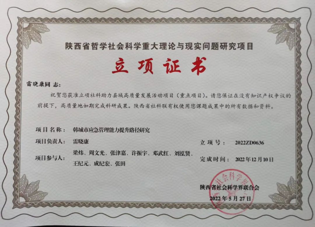 我院《韩城市应急管理能力提升路径研究》获陕西省社会科学界联合会立项