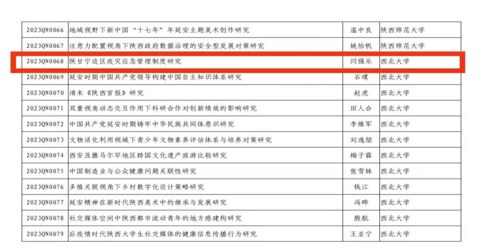 2023年1月18日,陕西省社会科学界联合会公布2023年度陕西省哲学社会科学研究专项青年项目立项结果的通知,陕西省应急管理研究院研究员、西北大学法学院闫强乐博士申报的“陕甘宁边区疫灾应急管理制度研究”项目获批立项。